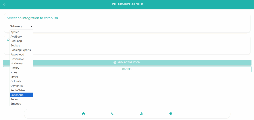 Inicia sesión con la cuenta proporcionada en el paso 01. Abre el menú de hamburguesa en la esquina superior izquierda y selecciona “Centro de Integraciones”. Haz clic en “Nueva Integración”, elige tu PMS e introduce los datos requeridos.