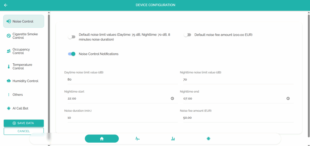 Para acceder a todas las opciones de configuración de tu dispositivo StayControl, haz clic en el icono de engranaje. En el menú de la izquierda, selecciona el parámetro de monitorización que quieras configurar, como ruido o humo de cigarrillo. En el lado derecho de la pantalla, podrás renombrar el dispositivo, ajustar importes de tarifas, establecer disparadores para día y noche, activar o desactivar notificaciones, configurar AI Concierge para llamadas de gestión de incidencias y explorar muchas otras opciones.