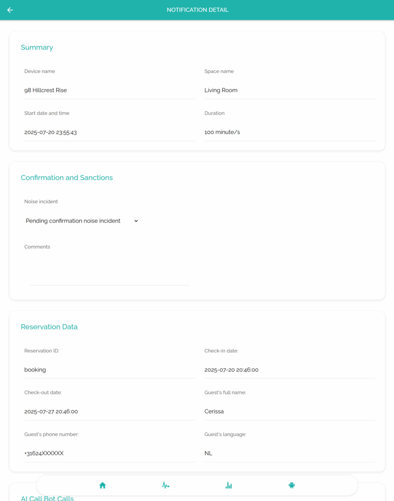 Una vez que se genera una alerta, la IA realiza una llamada profesional en el idioma preferido del huésped. Explica la situación de manera tranquila y solicita colaboración, ayudando a resolver los problemas rápidamente sin confrontaciones.