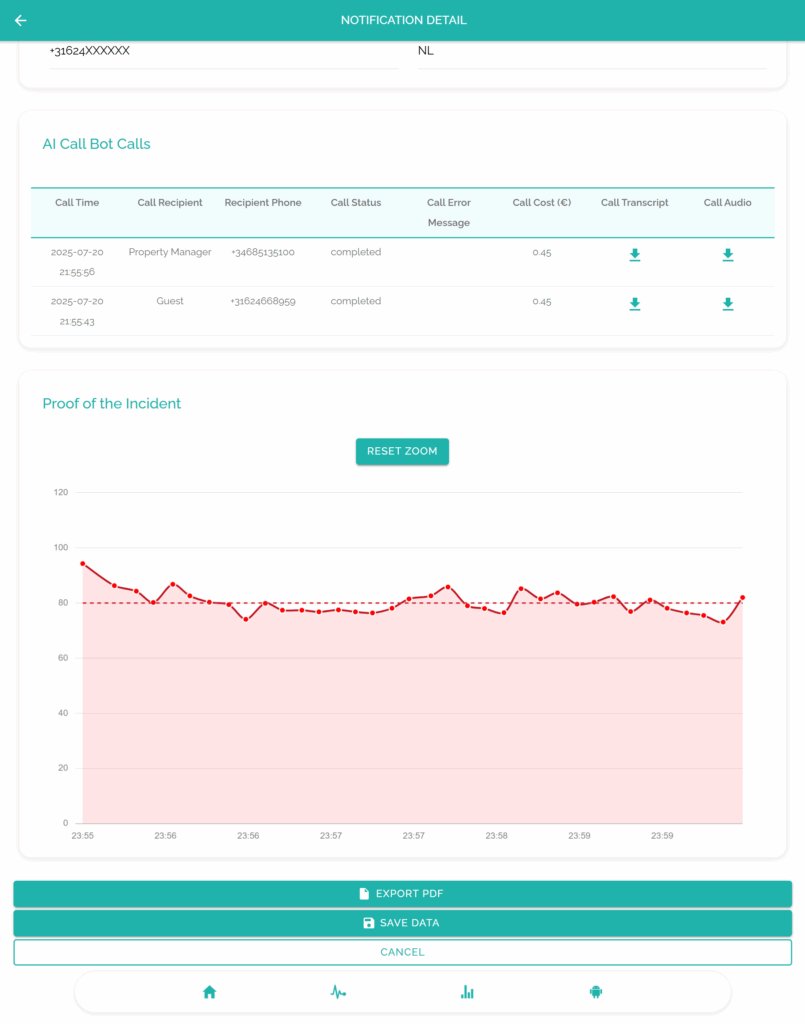 Every detection, call, and outcome is time-stamped and stored, providing a clear record for OTAs, insurance claims, or internal audits.